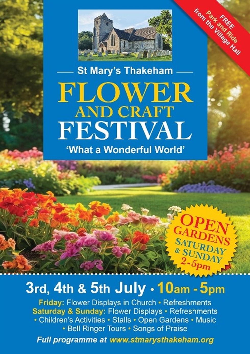 St Mary’s Thakeham biennial Flower Festival is being held over 3 days (3-5 July 2026).The theme for the flower arrangements in the church is “What a Wonderful World”. Alongside this there will be crafts, a children’s tent, quiet corner, refreshments, music, open gardens, etc.