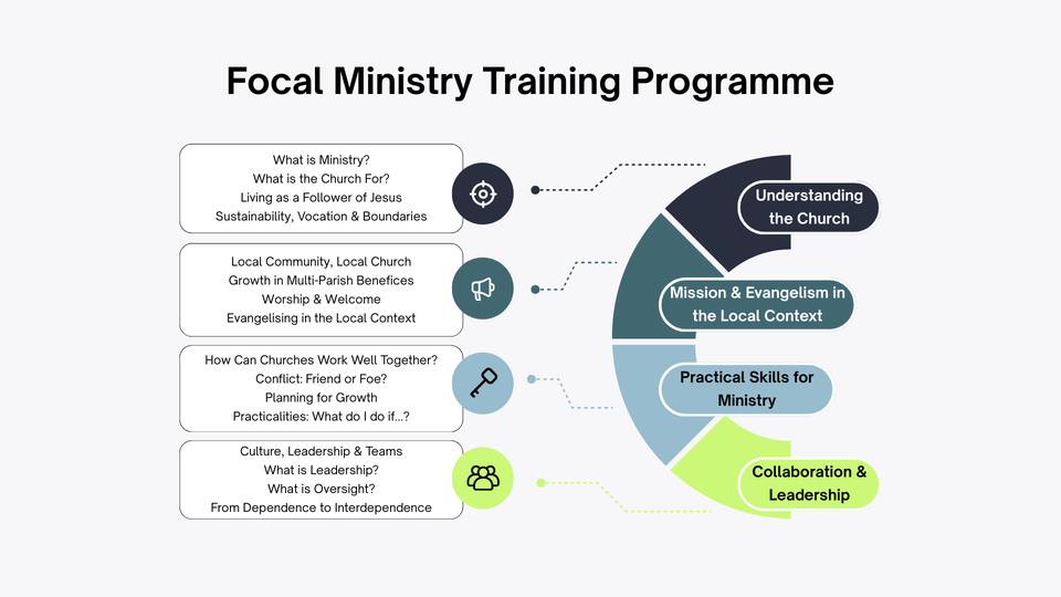 The Focal Ministry Pathway provides training and support for individuals to take a share in the responsibility for leading a single church within a multi-parish benefice, under the overall oversight and authority of the Incumbent. Their specific responsibilities are based on the parish context and by their own experience and training, with the details agreed collaboratively between the Focal Minister and Incumbent, and signed off by the Head of Apostolic Life.